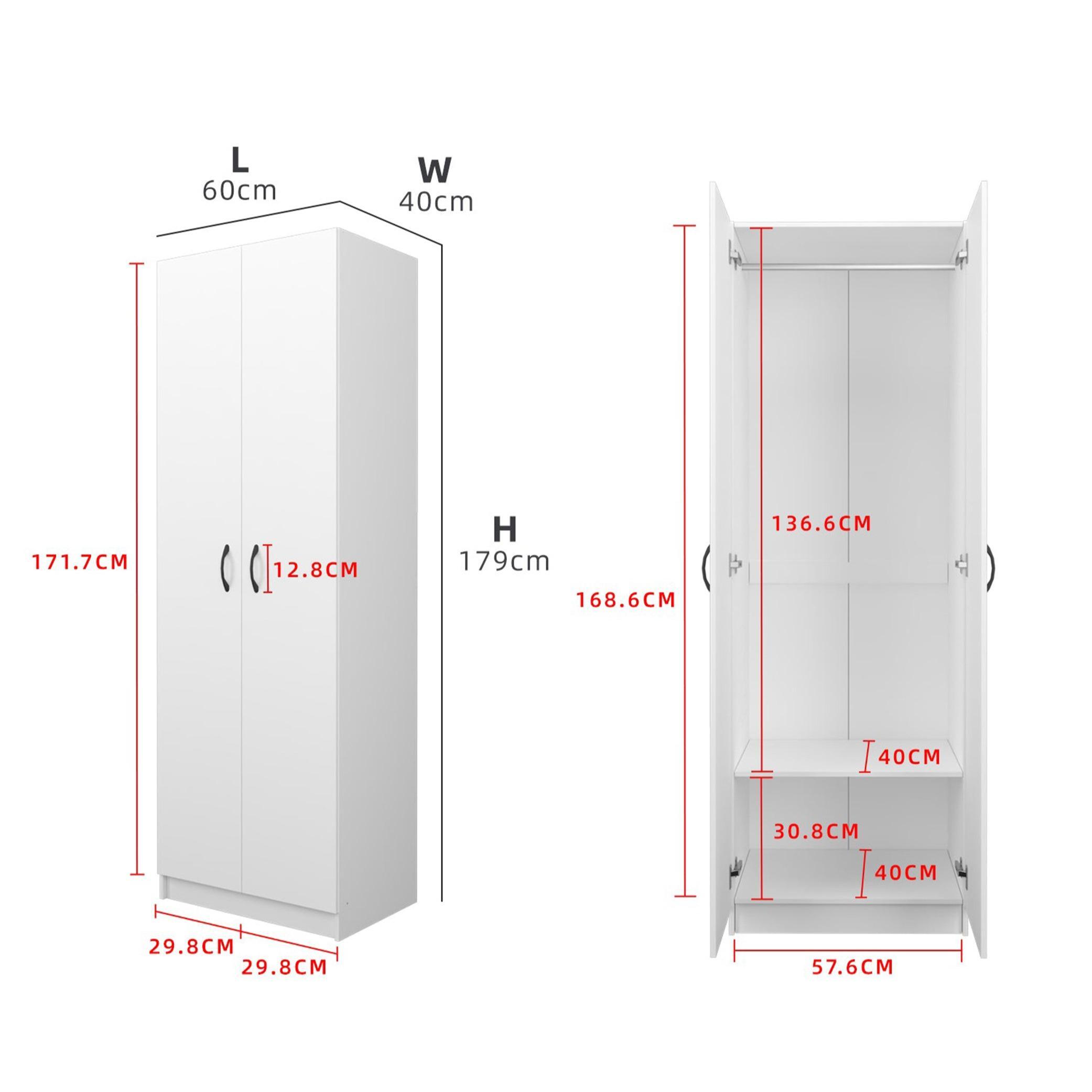 KitchenZ Wooden Wardrobe with 2 Door H179cm 12mm thick Board Wardrobe Storage Cabinet Extra Larger Storage Space Hanger 60cm x 40cm x 179cm