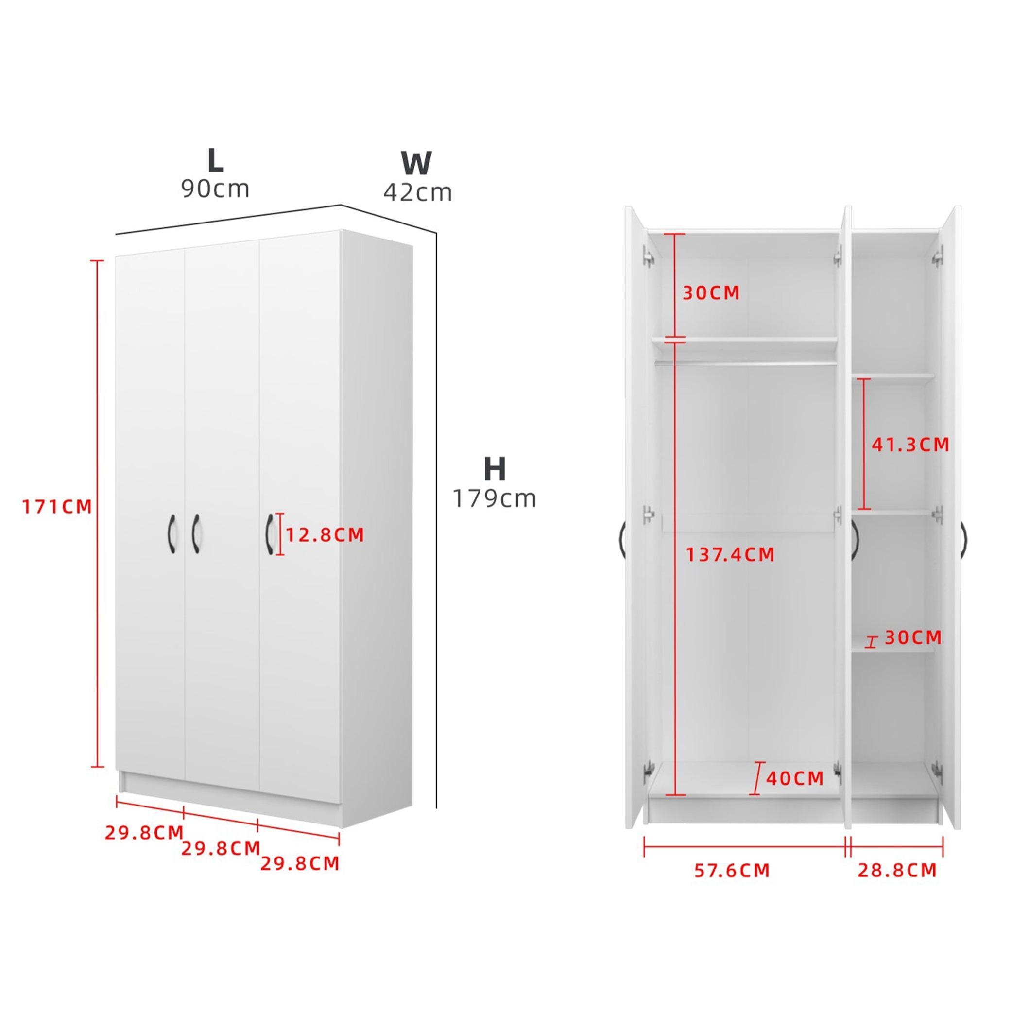 KitchenZ Wooden Wardrobe with 3 Door H179cm 12mm thick Board Wardrobe Storage Cabinet Extra Larger Storage Space Hanger L90cm x W42cm x H179cm