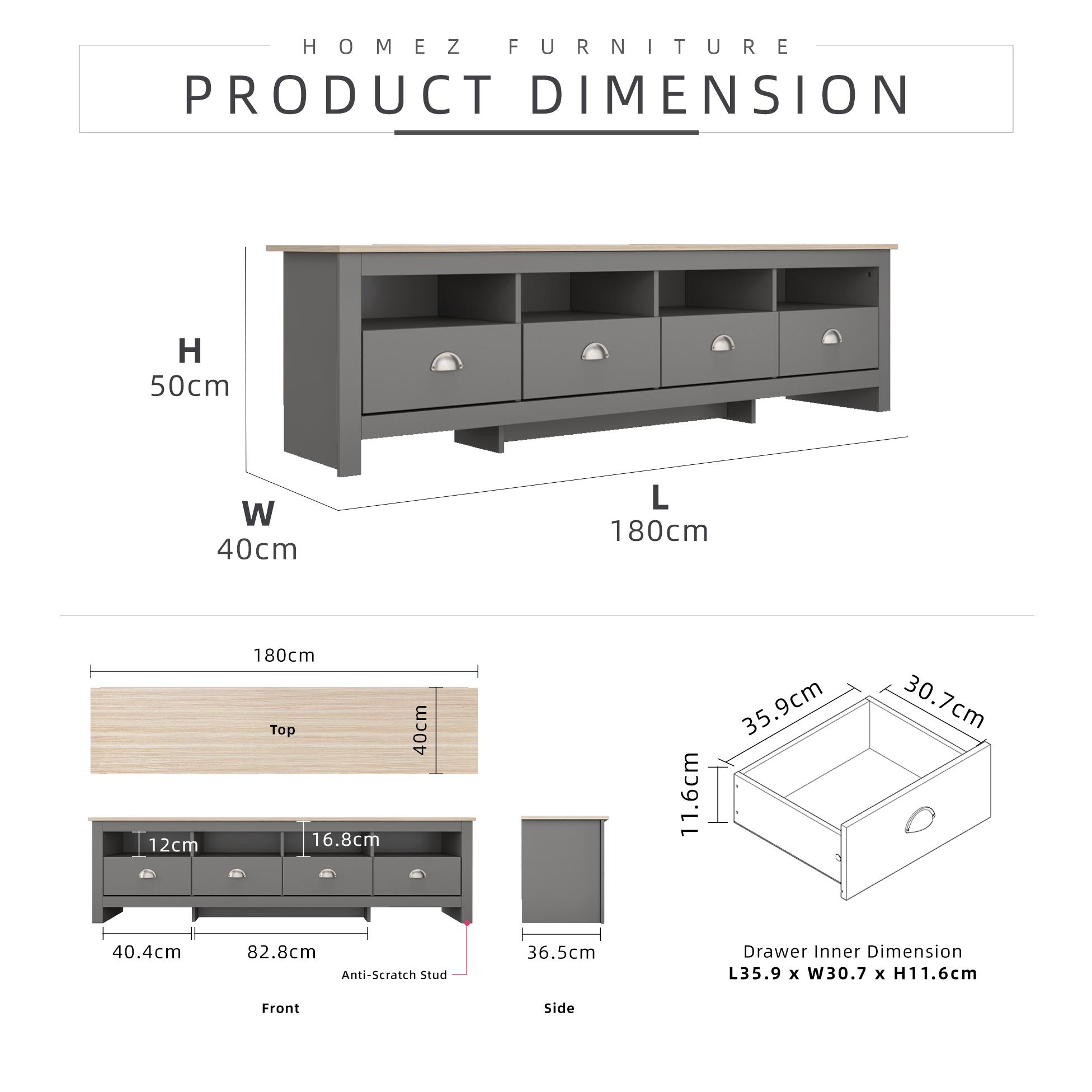 This TV cabinet includes 4 drawers and 4 open storage spaces, ensuring your essentials are neatly organized. The dimensions are L180cm x W40cm x H50cm, making it ideal for a 5.9FT TV. It comes with a 1-year warranty but requires assembly. Modernist and simple in design, it's a practical addition to your home.