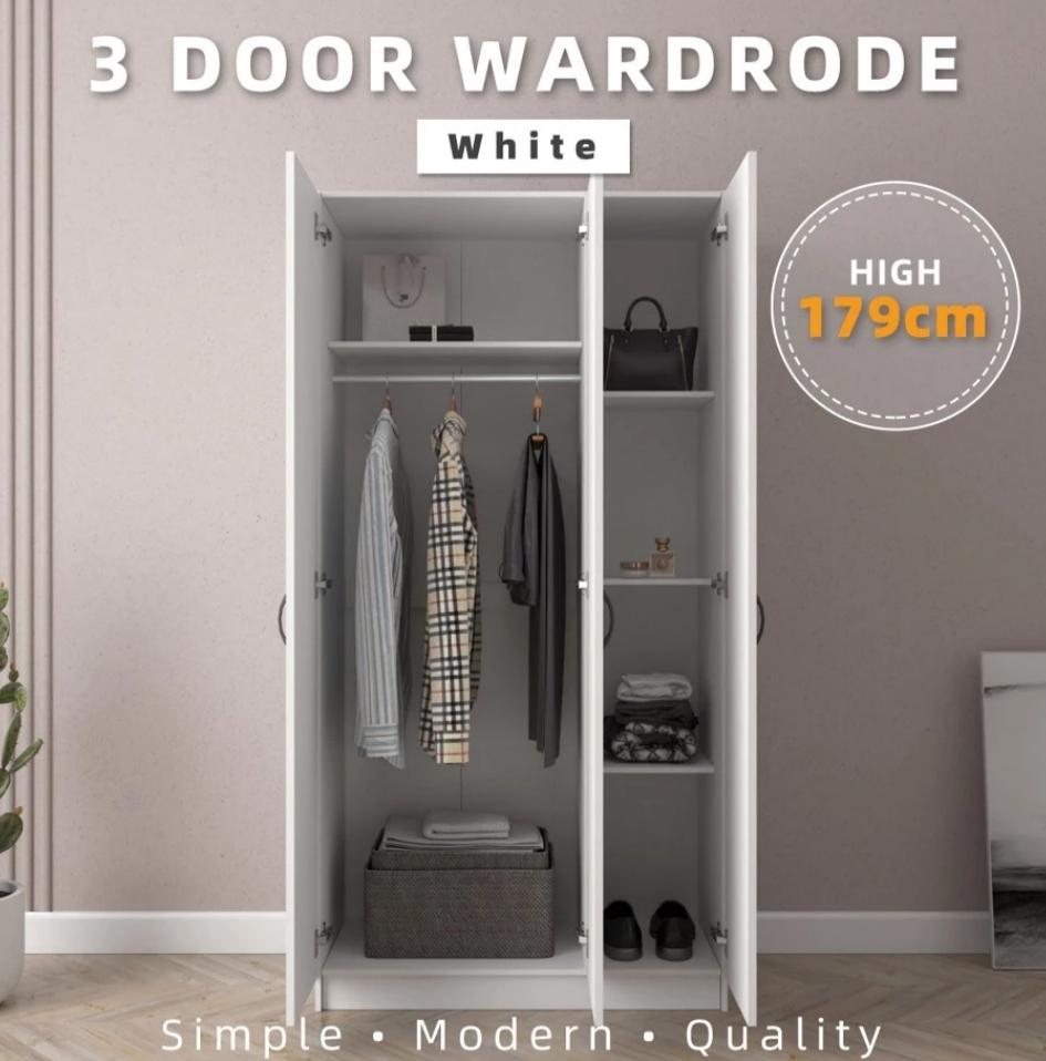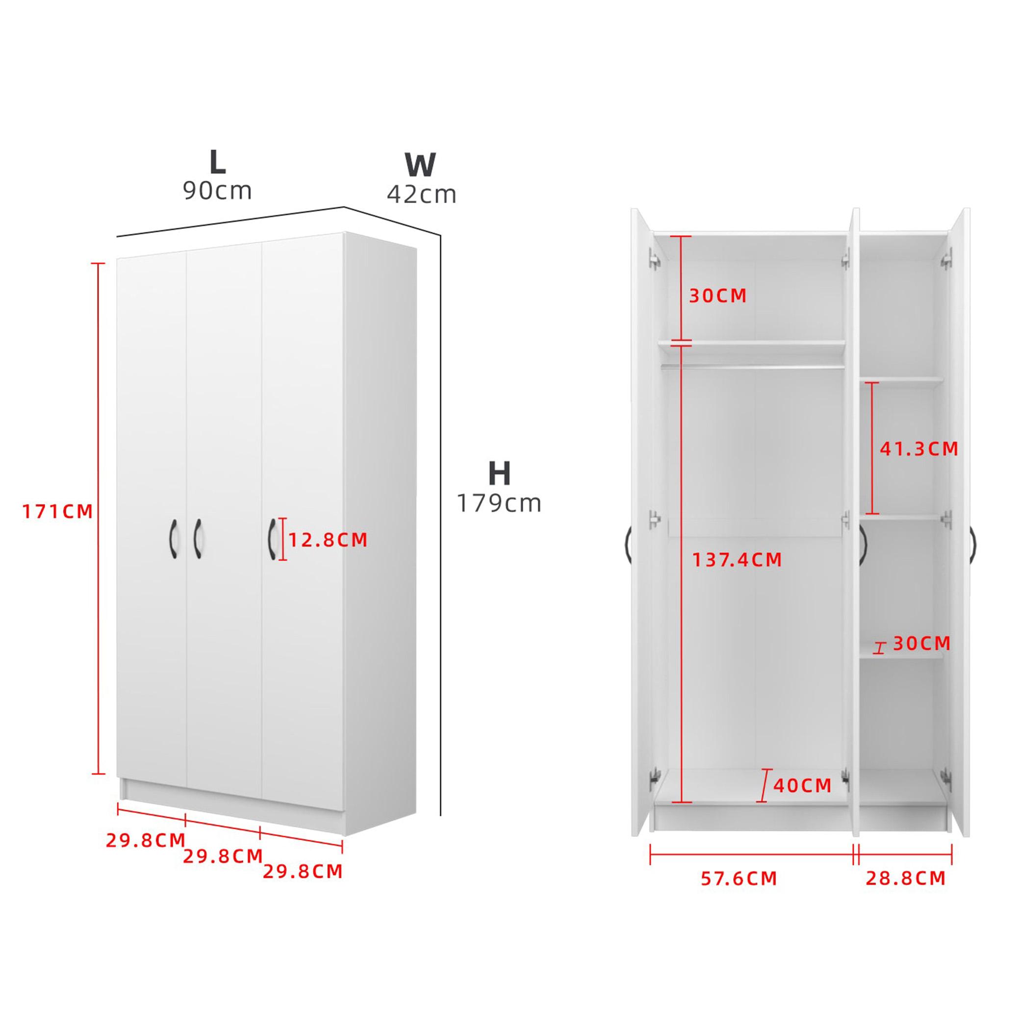 KitchenZ Wooden Wardrobe with 3 Door H179cm 12mm thick Board Wardrobe Storage Cabinet Extra Larger Storage Space Hanger L90cm x W42cm x H179cm